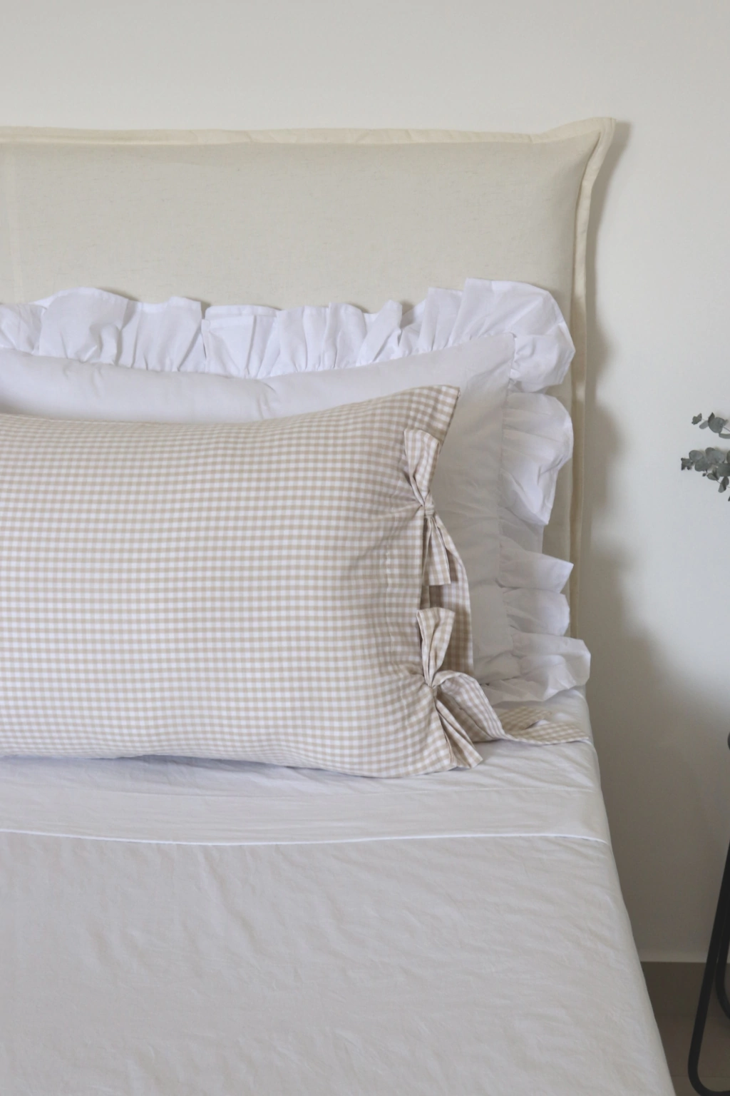 Todos os tecidos são 100% algodão e os modelos que possuem laços contém abas para colocar o travesseiro.